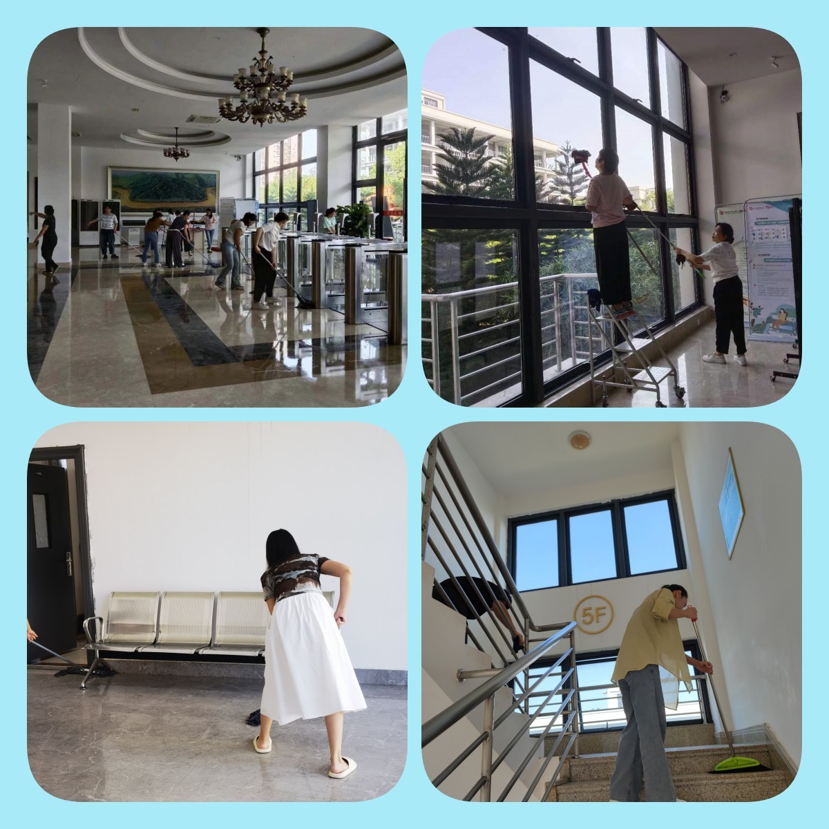 2023年9月1日,图书馆组织全体馆员对各借阅室、阅览区、自习室等桌椅、书架、玻璃、地面、墙角区域进行全面清扫,不留卫生死角。在清扫过程中,大家不怕脏不怕累,分工合作,积极配合,有条不紊地开展清洁工作。(张新玲摄)