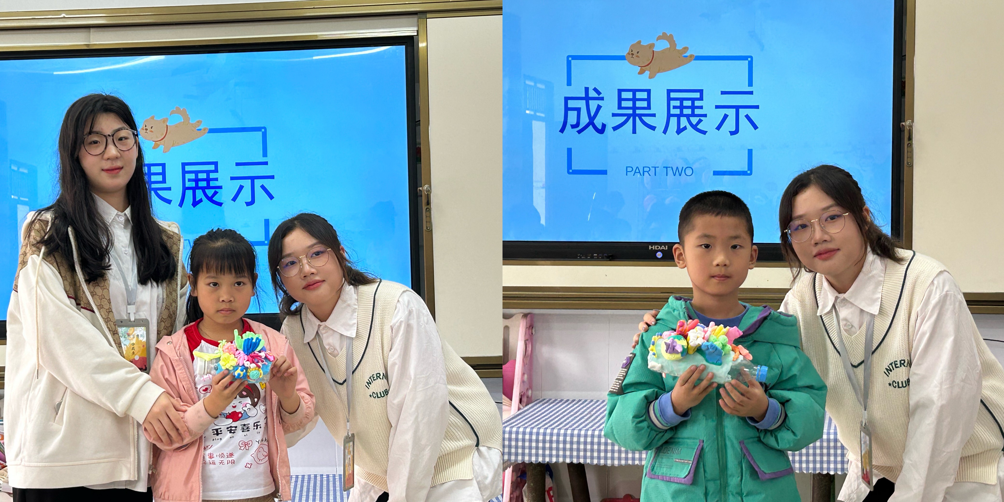 海洋生物创意黏土手工课堂上,学前教育专业的学生们引导小朋友说出自己喜欢的海洋生物,并通过生动的短视频引发孩子们对使用黏土创造海洋生物的兴趣。随后,在向小朋友们介绍相关制作过程和注意事项后,学前教育专业的学生们向小朋友分发手工黏土材料,并分组指导小朋友创造出自己喜欢的海洋生物。