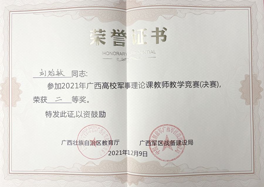 喜报:我院教师刘贻敏荣获全区高校军事理论课教师教学竞赛(决赛)二等奖