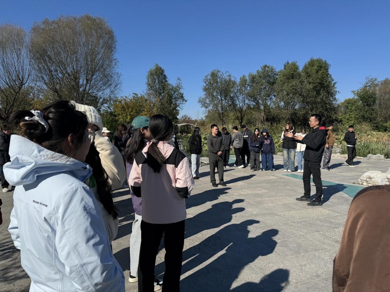 随后,实践教学团队带领学生走进北京六环内最大“绿肺”—— 温榆河公园,将教学重点转向“大型生态景观园林”的认知与学习。
