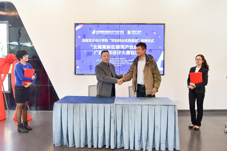 北海高新技术产业开发区管委会、北海艺术设计学院、北海人力资源与社会保障局、共青团北海市委员会的相关负责人,还有我院的师生们共同参加了北海艺术学院双创综合实践基地挂牌仪式暨“北海高新区银河产业城杯”广西创新设计大赛启动仪式。