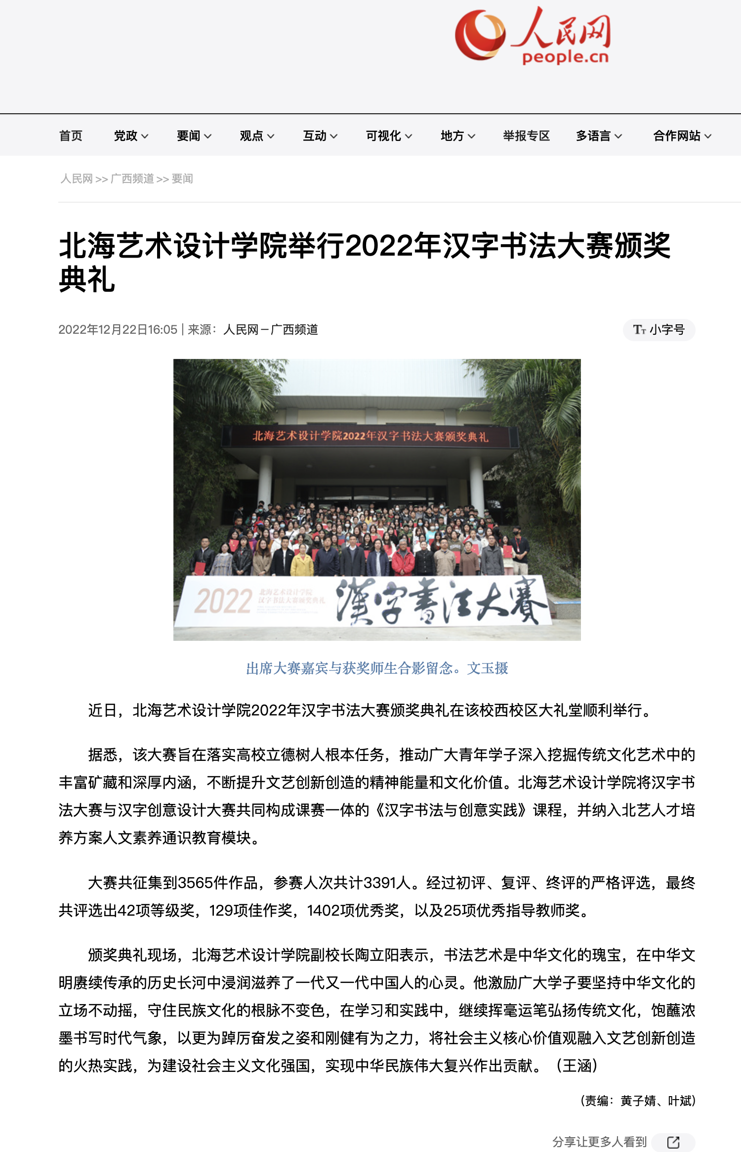 人民网:北海艺术设计学院举行2022年汉字书法大赛颁奖典礼