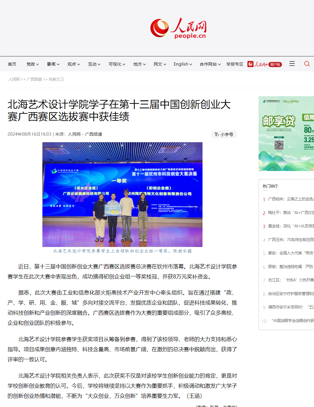 人民网:北海艺术设计学院在中国国际大学生创新大赛(2024)“数广集团杯”广西赛区选拔赛获佳绩