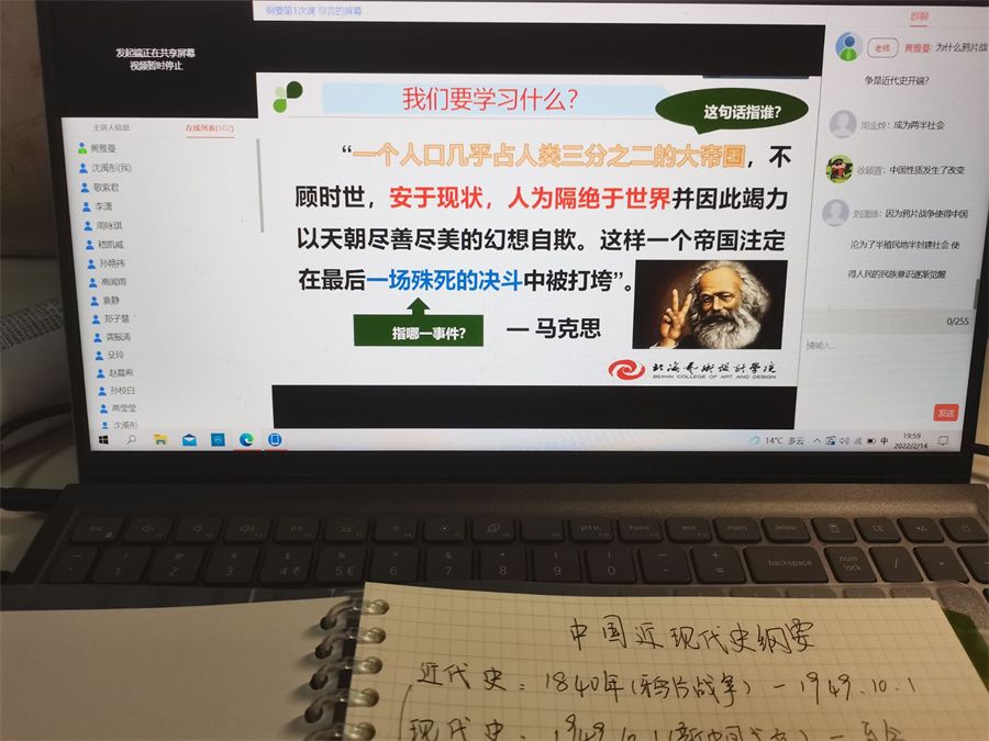 经过周密准备,马克思主义学院于2月14日上午8点准时按照课表开展线上教学,所有思政课的第一次网课直播顺利完成,各项教学工作井然有序进行。任课教师在网上教学中坚持抓好课堂纪律,严格考勤,认真讲课,及时答疑,确保线上教学质量。据统计,开学思政第一课学生到课率高,学生课后反映热烈,收效良好。(黎毅/摄)