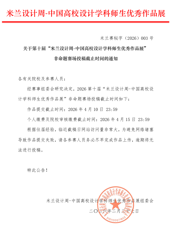 关于第十届“米兰设计周-中国高校设计学科师生优秀作品展” 非命题赛场投稿截止时间的通知