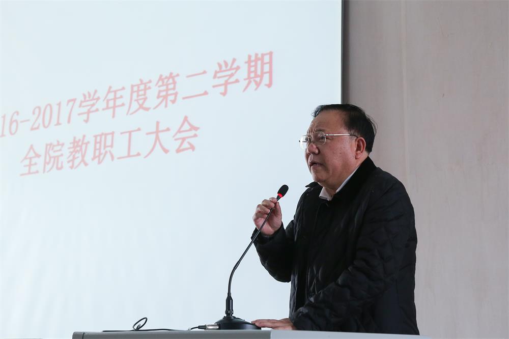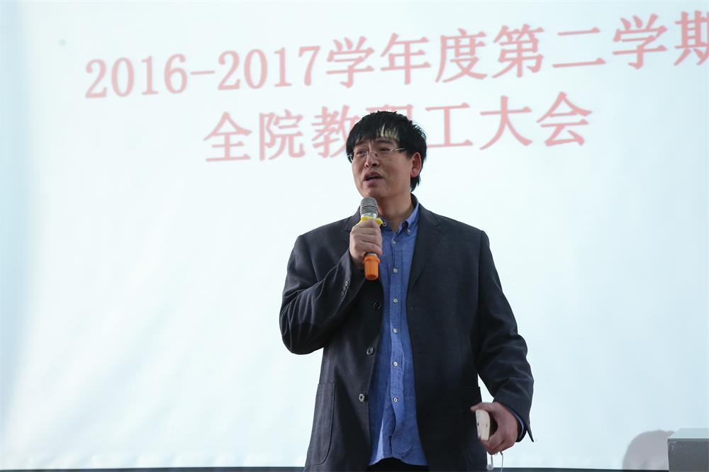 随后,党委书记贺平对新学期的工作进行了全院动员。他指出,新的学期各位老师应充分认识到学院面临的形势,了解自身的责任,在工作上多点努力,少点抱怨。同时,学院还要加强贯彻思想政治工作、师德建设,提高高校教师的能力。另外,贺争平书记对“两学一做”学习教育提出了要求。要把“两学一做”与学院评估工作结合起来,全体党员要认真履行职责,发挥模范带头作用,为学院发展作贡献。