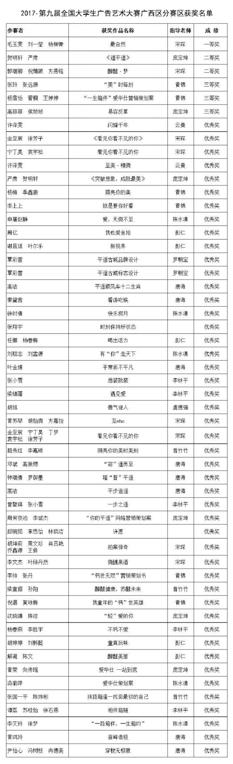 据悉,今年我校报送的学生参赛作品,有多组团队的作品从广西赛区50多所参赛的大学中脱颖而出,参与本届全国大广赛,并从30余万作品中胜出,最终斩获本届全国大广赛全国三等奖1项和全国优秀奖9项。同时,还获得大广赛广西赛区一等奖1项、二等奖2项、三等奖3项、优秀奖47项的优秀成绩。为我校赢得了良好的社会声誉和影响。