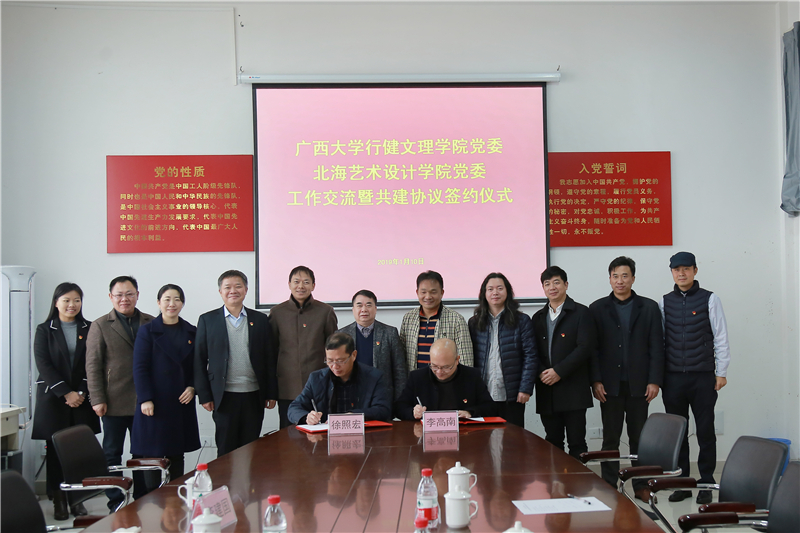 随后,由广西大学行健文理学院党委书记徐照宏与我校党委书记李高南代表双方党委共同签署了《结对共建协议书》,双方同意积极探索结对共建的有效平台、方式、载体,形成共建共享机制。此次签约,必将掀开双方党建的新篇章,相信在两校党组织的共同努力下,党建工作定能多出成果、多出特色、多出经验,以党建引领学校各项事业发展同频共振、齐头并进,实现双赢。
