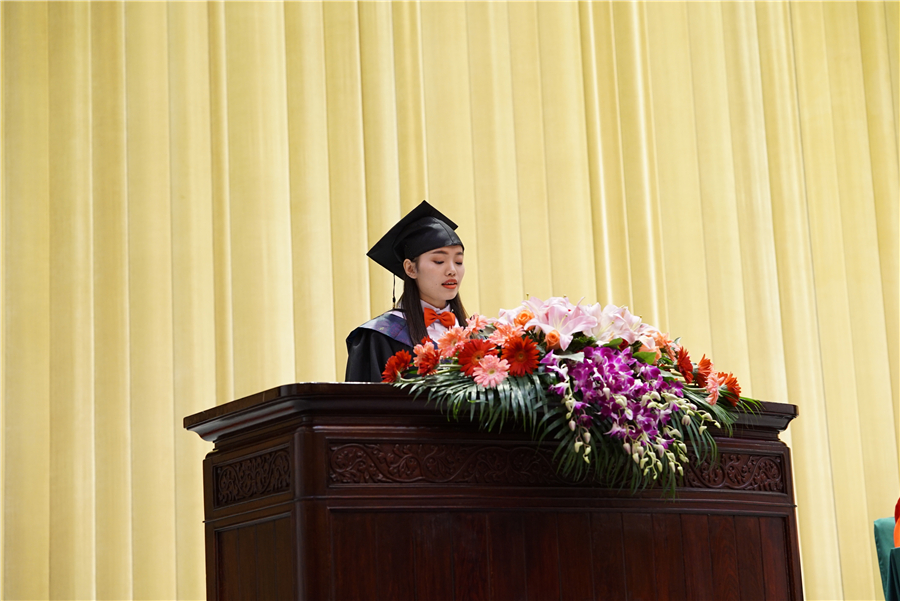 路建同学作为学生代表发言。在发言中她代领大家回忆起北艺生活时的点滴,表达了对母校的恋恋不舍。离别在即,她寄语每一位毕业生,牢记北艺的校训,拥抱属于我们的美好时代,为担负起建设伟大复兴的中国梦的使命而努力奋斗。