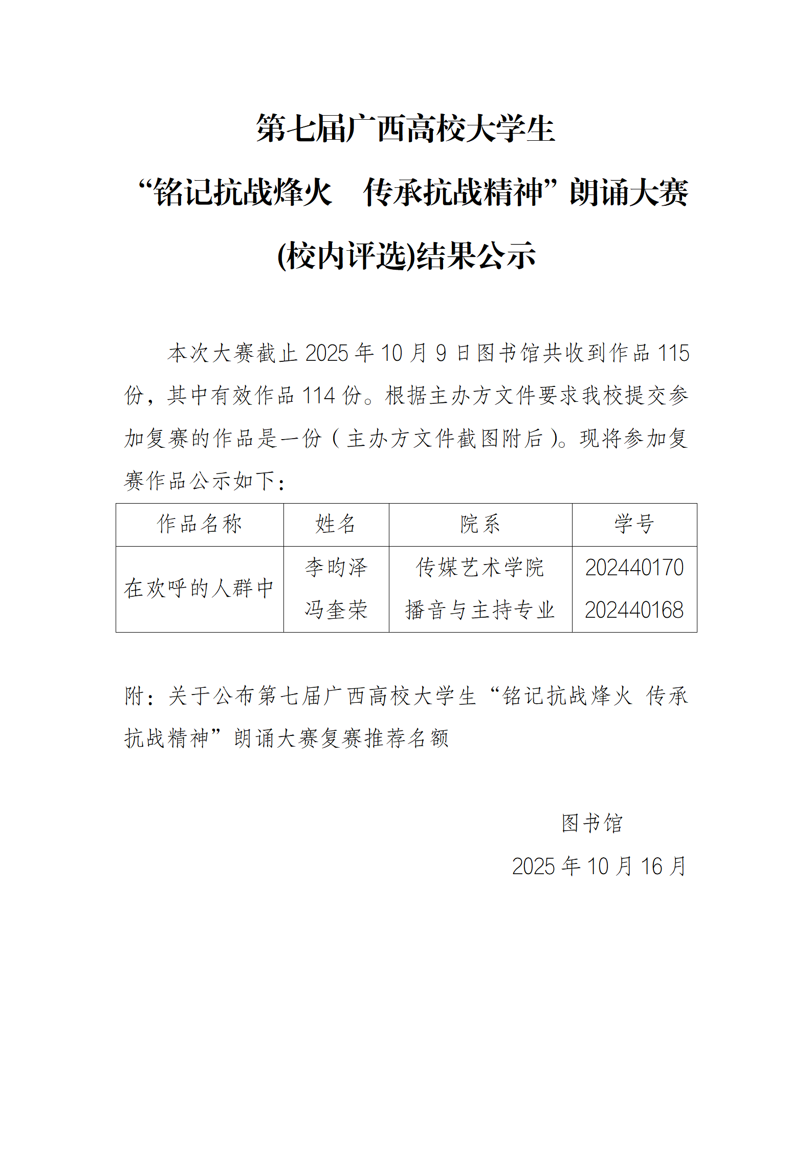 关于公布第七届广西高校大学生“铭记抗战烽火 传承抗战精神”朗诵大赛复赛推荐名额的通知