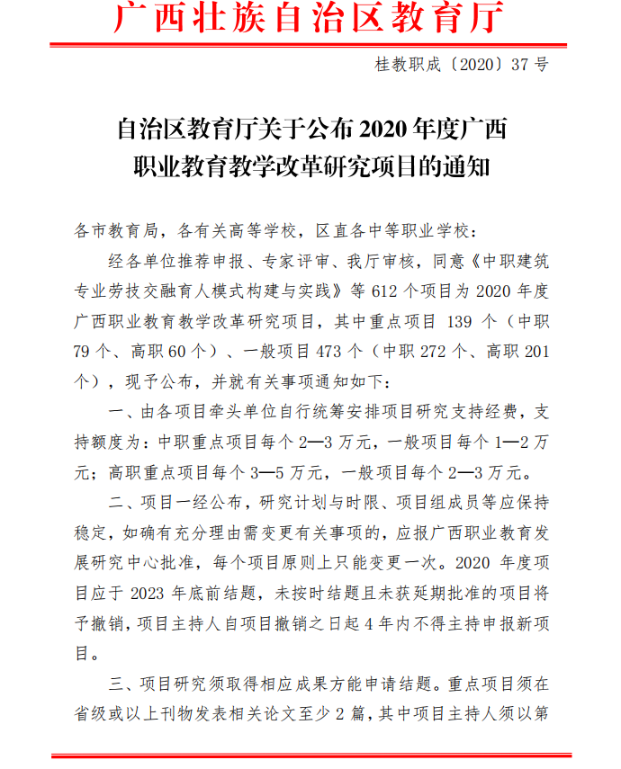 自治区教育厅关于公布2020年度 广西职业教育教学改革研究项目的通知