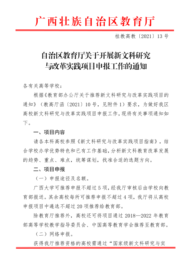自治区教育厅关于开展新文科研究与改革实践项目申报工作的通知
