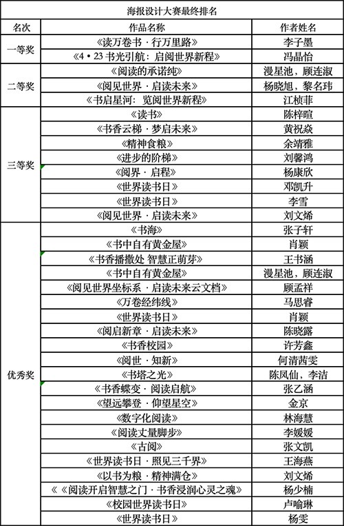 作为重头戏的“世界读书日”校园海报设计大赛首次设立纯设计与AIGC双赛道,这也为同学们的海报创作提供了新的设计思路。评审老师介绍:“参赛作品在创意表现、技术应用等方面有较高的水准,特别是AIGC赛道作品将人工智能与传统设计完美融合是一次特别的创作尝试。”经专业评审团三轮遴选,海报设计共有三十四人次获得各类奖项,获奖名单如下:
