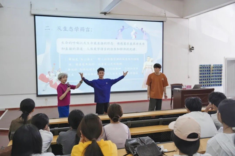 为让师生更直观地理解舞蹈“身心共生”的内涵,万素教授从生态学视角进一步解读舞蹈作为独特的“身心语言”,既包含纯粹直接的情感宣泄,也蕴含源自心灵深处的细腻感知;其“身体运动方式”涵盖舞种风格、技术精度、韵味层次及人体关系美学塑造等维度。她特别邀请现场师生上台参与互动演示,通过真实肢体表达,使“身心共鸣”的艺术原理从理论走向实践,让在场师生直观理解舞蹈的身心联动机制。
