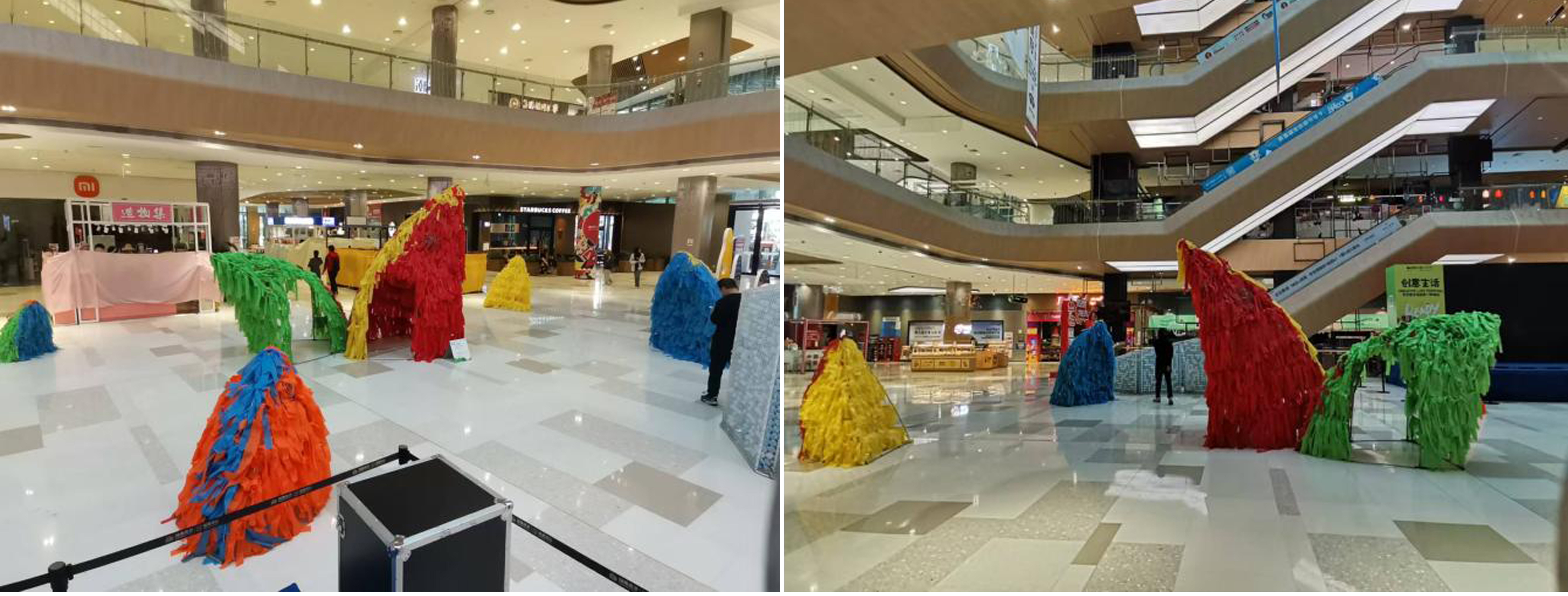 从现场的展览看出,这一活动受到了市民的广泛欢迎。与市民朋友聊天时,市民韦女士表示:以往欣赏这类艺术展要到专业展会上才能看到,没想到今天带孩子来逛街就能近距离感受艺术的魅力,非常期待这样的活动能常态化开展。市民先生也提到:今天来逛街,还能欣赏到艺术装置,并在艺术市集上淘好货,很有意思。希望公共文化进商圈活动能长期举办,让艺术走进生活。我院的作品《蛙声一片》坐落于商场的一楼大厅,游客进出商场都可以与作品形成互动。这六只不同色彩对比、抽象构成的青蛙形成了强大的空间气场,点燃了巨大商场的空间氛围,增加商场的艺术气息与格调,给人带来了无限的互动乐趣。(欧安佳 摄)