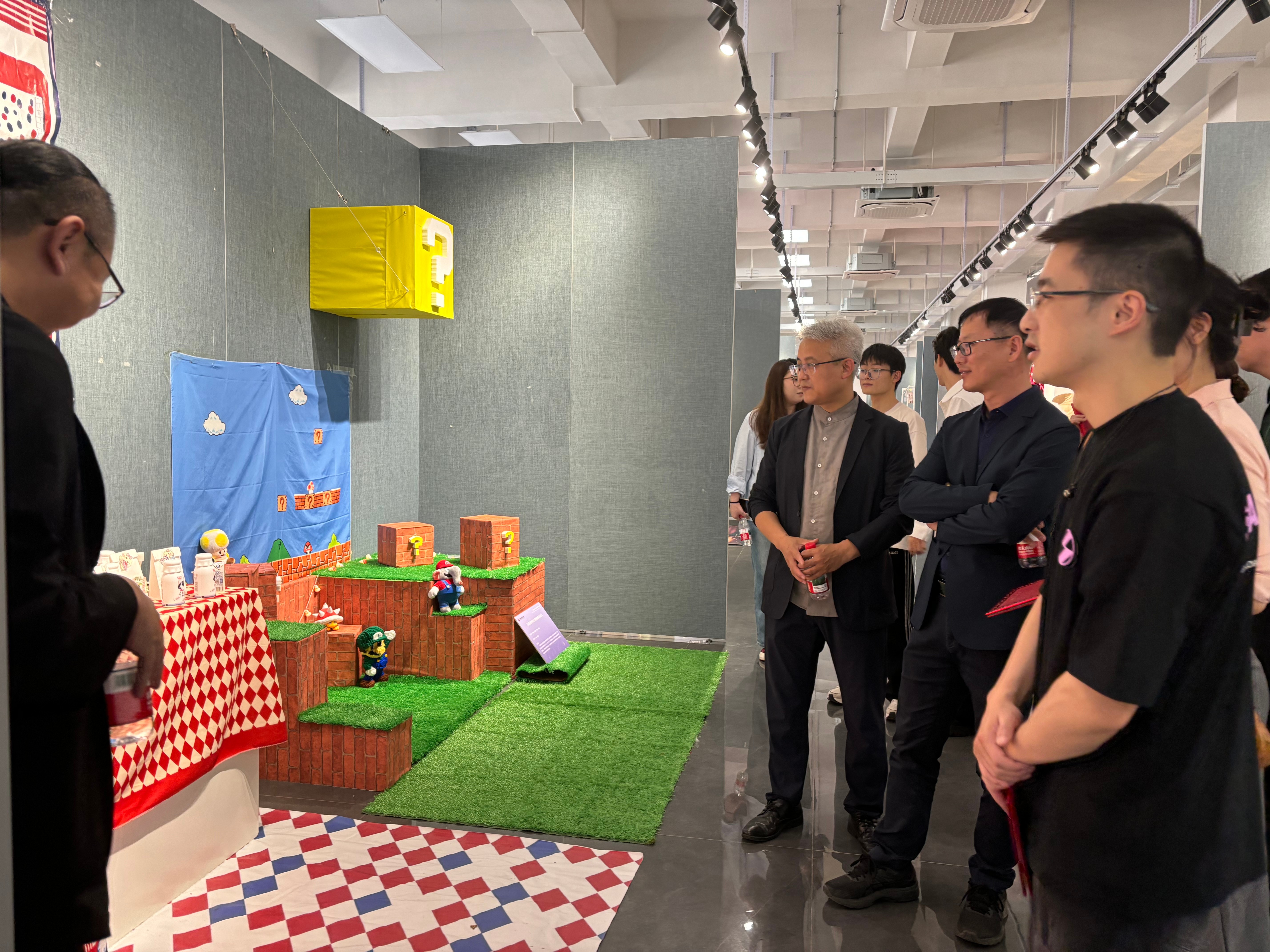 在最后的观展互动环节,现场气氛热烈非凡。各组参展学生们满怀热忱,纷纷化身为“作品代言人”,他们以自信且专业的姿态,将自己小组在创作过程中的奇思妙想、攻克的重重难关以及蕴含其中的设计理念娓娓道来,生动地展现出作品背后的故事,力求让领导、嘉宾和老师们全方位领略作品的魅力。与此同时,他们还展现出了极高的学习热情与谦逊态度,专注地聆听着领导、嘉宾和老师们提出的宝贵指导意见。整个互动环节,思想碰撞出的火花四处绽放,为这场美陈展增添了别样的精彩与深度。