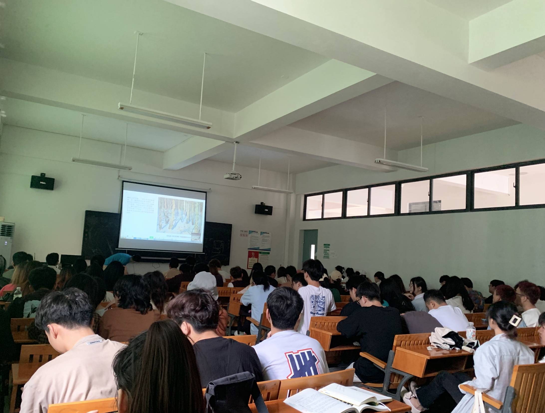 郑光旭老师以个人作品与学习经历作为背景,以绘画创作的过程为线索,对其中目的与方法进行分享,以及三者之间相辅相成的紧密关系进行探讨。郑光旭老师指出“真实的再现不等于现实的复制”。鼓励学生在绘画创作中寻找感受,带着感受去选择绘画客体,从而探寻其本质及创作的基本方向与富有创造性的精神生产生活。