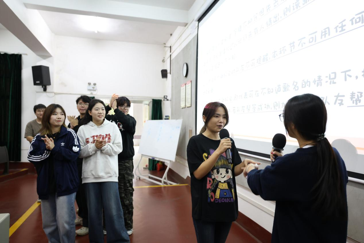 随后“开门大吉”猜歌挑战中,各小组代表踊跃抢答,部分代表现场演唱加分,将氛围推向高潮;“谁是卧底”推理游戏考验成员语言表达与逻辑推理能力,各小组代表在游戏中巧妙描述、谨慎判断、理性投票,在紧张刺激的博弈过程中,不仅加深了彼此间的信任,更展现了文学院学子的思辨风采。“你演我猜”游戏中,成员默契配合,趣味十足的互动不仅让现场笑声不断,更有效增强了小组内部的默契程度与协作意识。