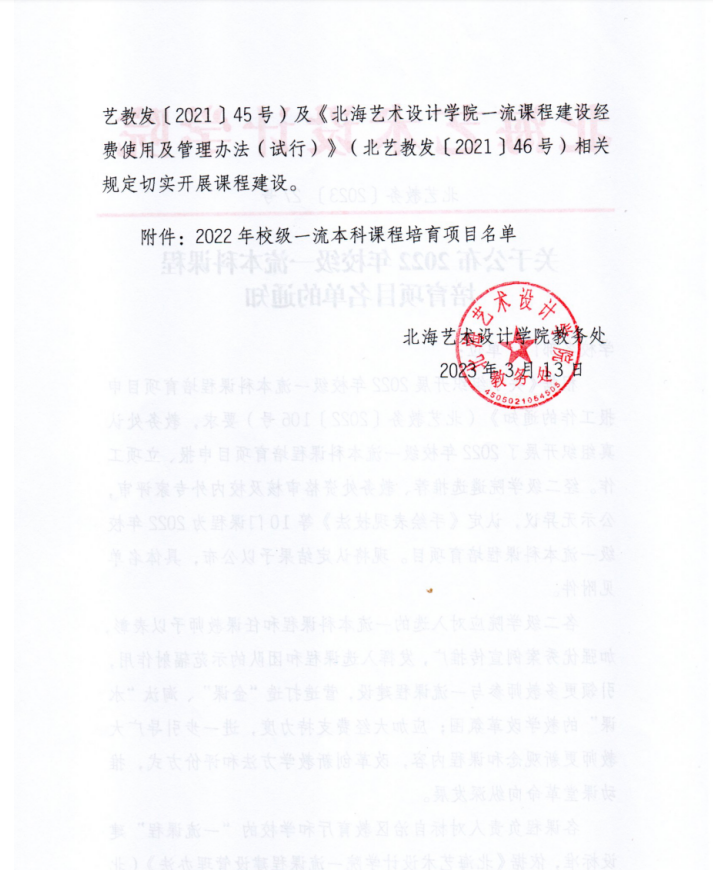 北艺教务〔2023〕27号 关于公布2022年校级一流本科课程培育项目名单的通知