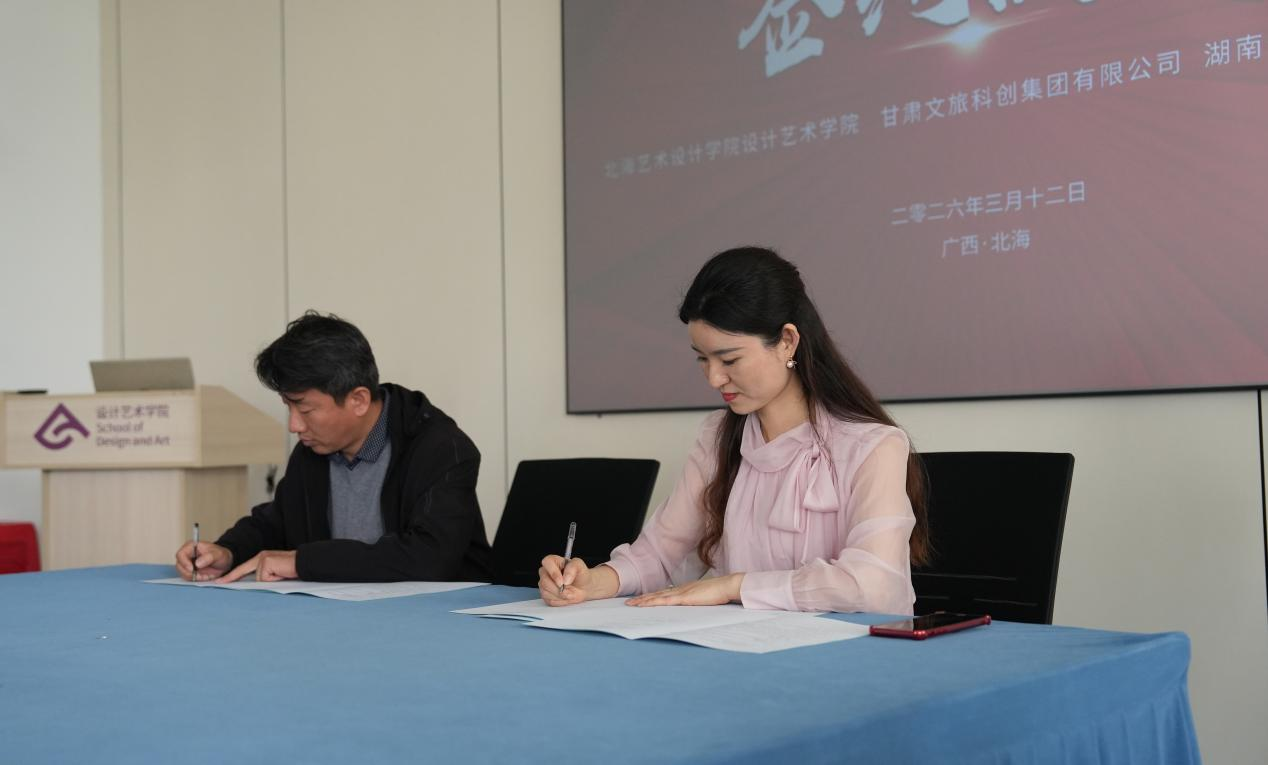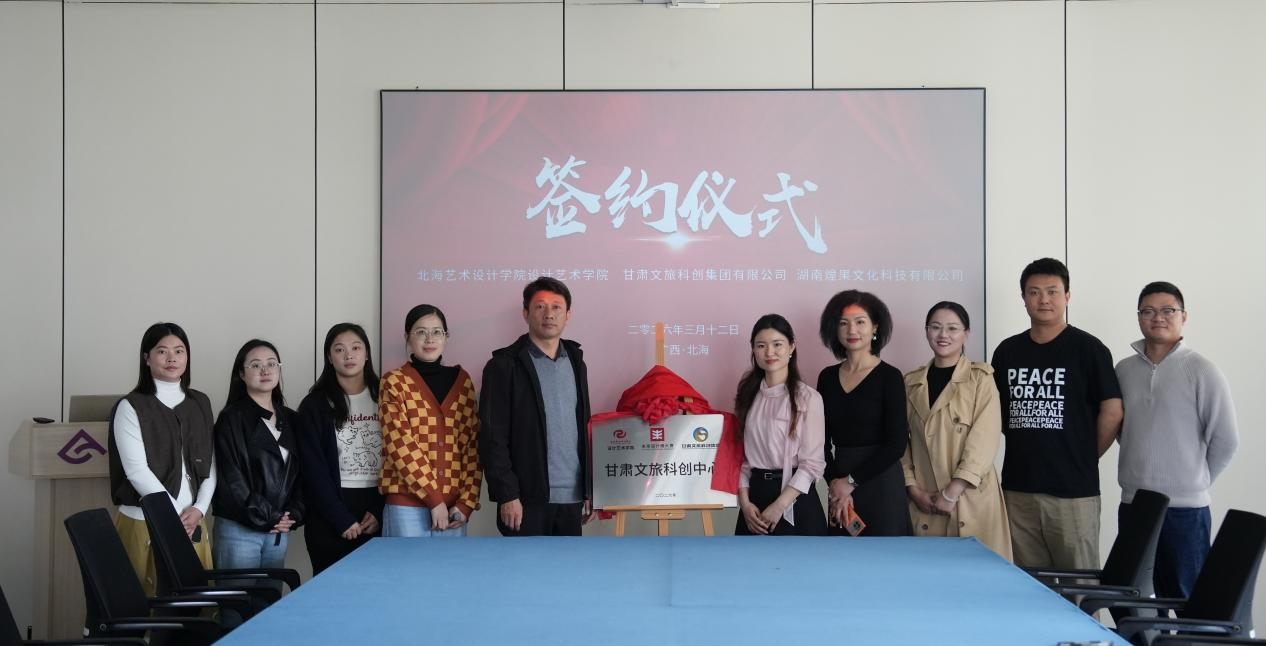 2026年3月12日,北海艺术设计学院西校区伦理楼408会议室迎来了甘肃文旅科创集团代表、湖南煌果文化科技有限公司负责人王平一行。企业代表与设计艺术学院白建强副院长、杨林副院长等领导及多位专业骨干教师就甘肃文旅设计项目合作事宜展开深入交流,并签署了三方合作框架协议。此外,还举行了“甘肃文旅科创中心”揭牌仪式。