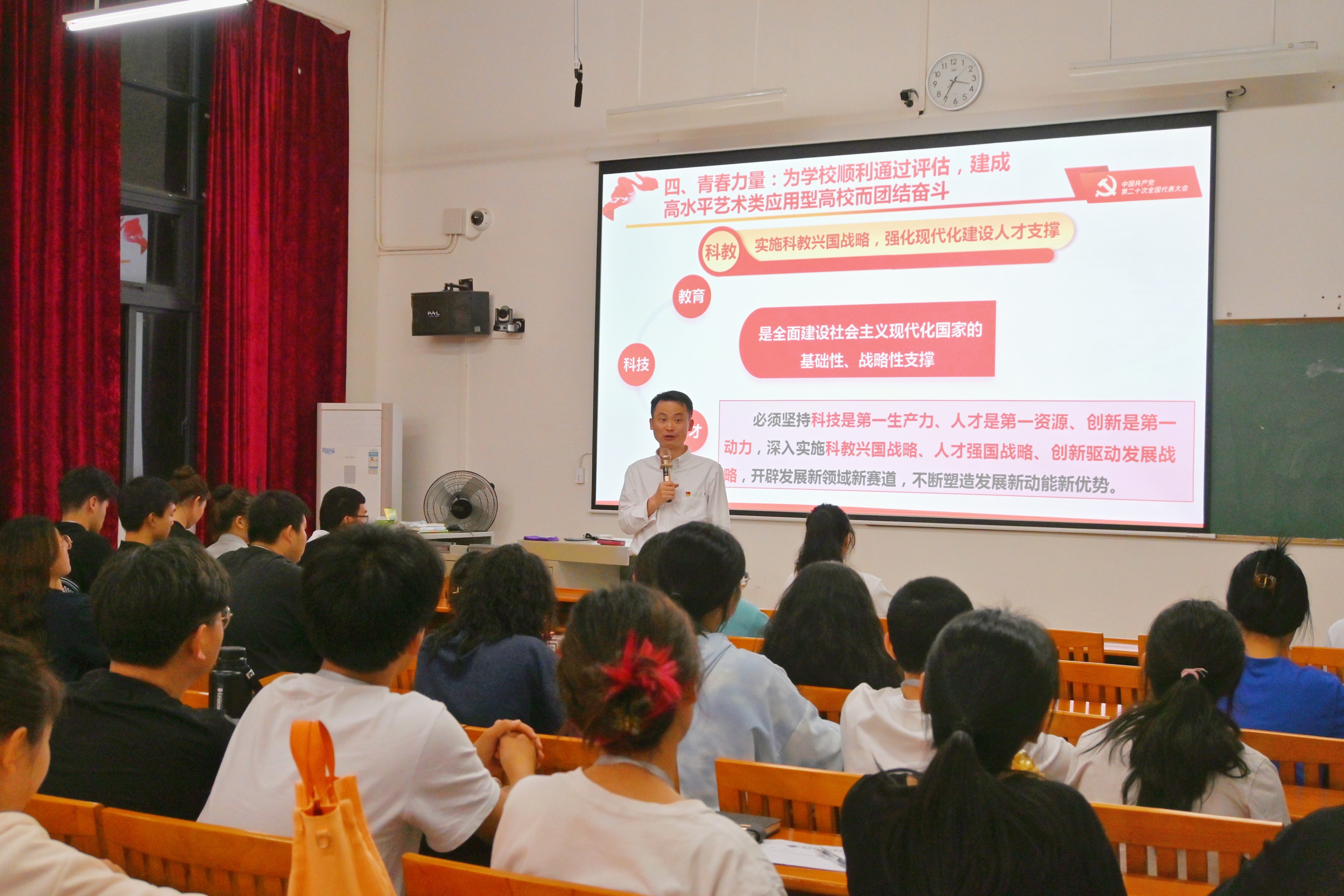 宣讲会最后,刘承初委员对同学们今后的学习生活提出建议。首先,提高思想认识,化“要我做”为“我要做”,转变思想,提高自觉主动性,用主人翁意识做好作为北艺学生干部的各工作。其次,建立榜样引领,于细微处显担当,号召同学们发挥先锋模范作用,从我做起,从小事做起,树立良好形象,以点带面,为创建良好学风、校风做贡献。最后,增强整体素质,积蓄奋斗力量,希望同学们不忘本职,加强学习,掌握本领,用实力展现北艺学子精神风貌,为建设社会主义现代化强国积蓄奋斗力量。(董秋伶  雷韦唯/摄)