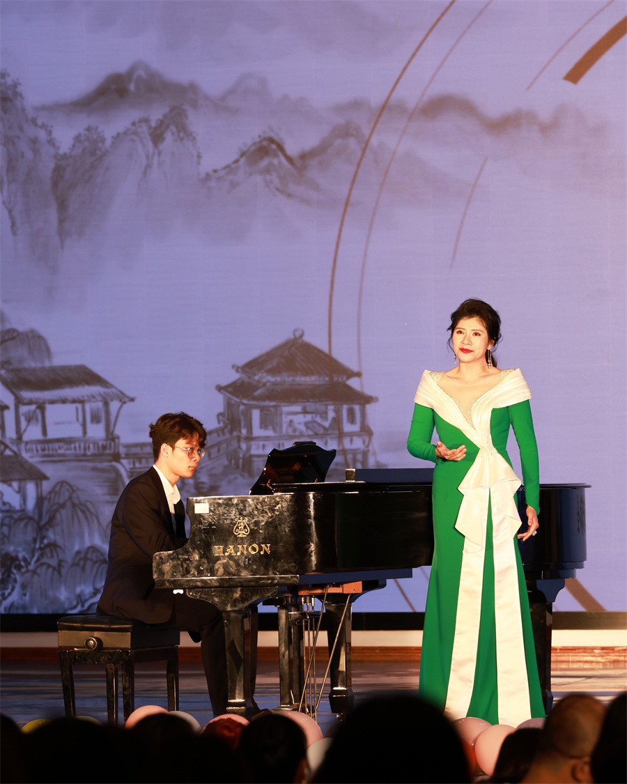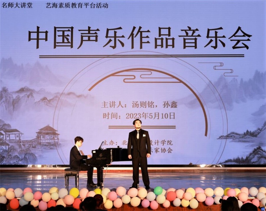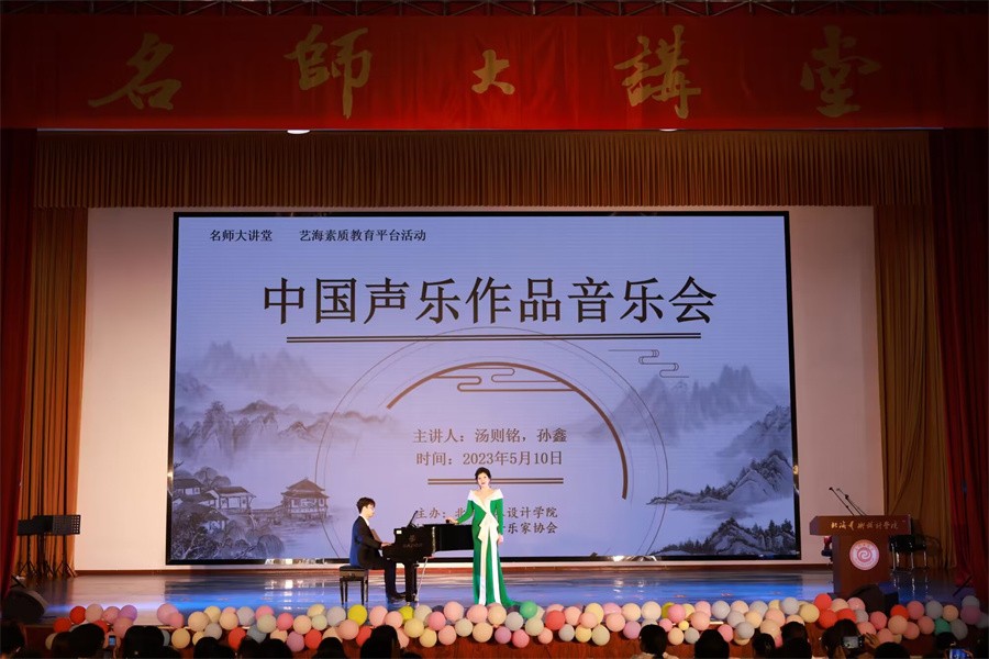 音乐会过程中,孙鑫教授结合歌曲背景及作品内涵,以《玫瑰三愿》为开场曲目赢得台下热烈的掌声,紧接着,她倾情演唱《春思曲》《红绣鞋》《关雎》《那就是我》《青玉案》《眺望》,在音乐的变幻中,情感层层推进,情绪愈涌愈烈,使现场听众思绪久久沉浸其中。汤泽铭教授深沉婉转的歌喉抒发着《怀念曲》的深切情感,他接连唱响《我住长江头》《明月几时有》《恒山月》《大江东去》《我爱祖国的蓝天》,歌声蔓延流转,意境悠远,演绎出音乐作品的层层美感。