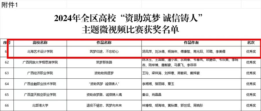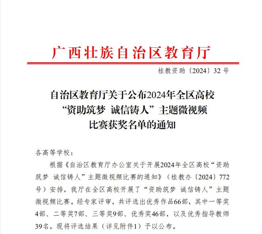 近日,由自治区教育厅组织开展的 2024 年全区高校 “资助筑梦 诚信铸人”主题微视频决赛顺利举行,我校7名学生共创的作品《筑梦归途,不忘初心》在比赛中荣获优秀奖。