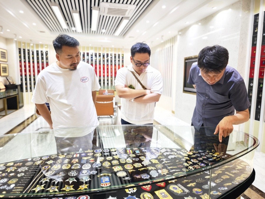 次日,考察组前往东莞开展实地调研。上午走进济安塑胶五金制品有限公司,该公司成立于1995年,在五金饰物、徽章纪念章等文创产品制造领域积淀深厚、口碑良好。考察组深入生产车间及流水线,全程观摩模具开发、压铸成型、抛光电镀等金属文创产品全套制作工艺,并就设计稿落地对接流程、设计方案适配金属工艺等议题与企业负责人开展技术交流。调研中发现,设计图稿的微小色差或结构疏忽在规模化生产中可能放大为严重工艺缺陷,这一发现为学院强化工艺可行性教育、完善设计落地相关课程提供了重要参照。