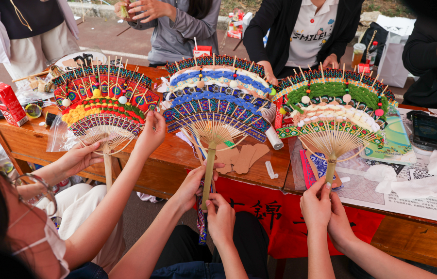 活动现场,项目团队集中展示了传统壮锦织锦、纹样绣品等系列手工作品。展品通过具象化的工艺呈现,系统展现了壮锦非遗的文化底蕴与艺术特质,为参与师生构建了直观的文化认知基础。作为活动核心环节,壮锦主题手工制作体验围绕非遗传承与艺术疗愈双重目标展开。项目团队精心筹备了冰箱贴、扇子、手工香皂等多元文创制作材料,采用分组指导、一对一讲解的服务模式,从制作流程规范、装饰技巧运用到安全操作要点等方面进行细致辅导。参与师生严格遵循制作规范,有序完成素材裁剪、纹样粘贴、图案装饰等操作步骤,将壮锦经典元素与创意表达相结合,在沉浸式实践中实现压力舒缓与动手能力提升,现场呈现出专注协作、互帮互助的良好氛围。