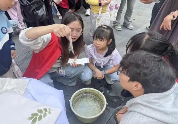 活动设植物拓染手工体验区、漆扇创作手工体验区及社区志愿服务工作组,志愿者们分工协作,保障活动高效推进。两大体验区开放后迅速成为居民参与热点,志愿者贴心提供创作材料,助力参与者完成作品。服装学院团总支书记陈琛还现场开展植物拓染技艺教学,带领大家感受传统手工艺的文化魅力。不少亲子家庭积极参与,在创作中收获乐趣与成长。